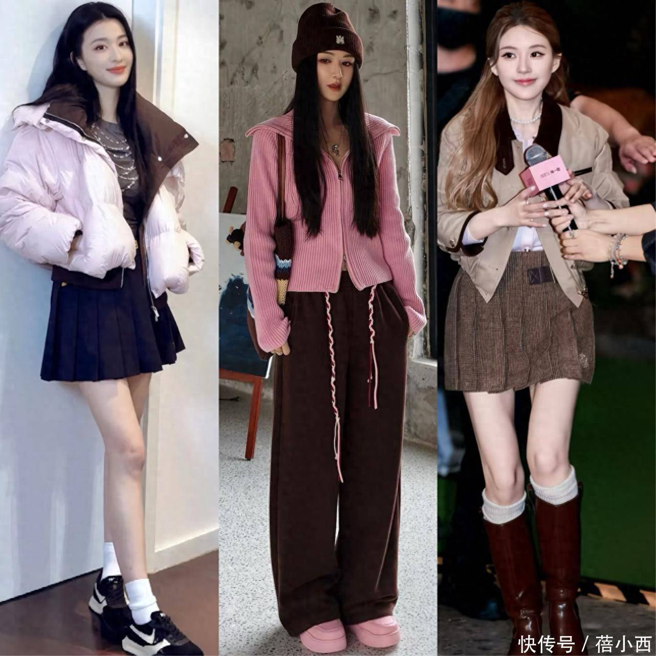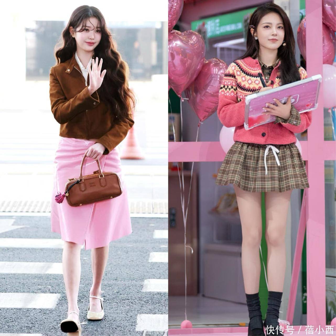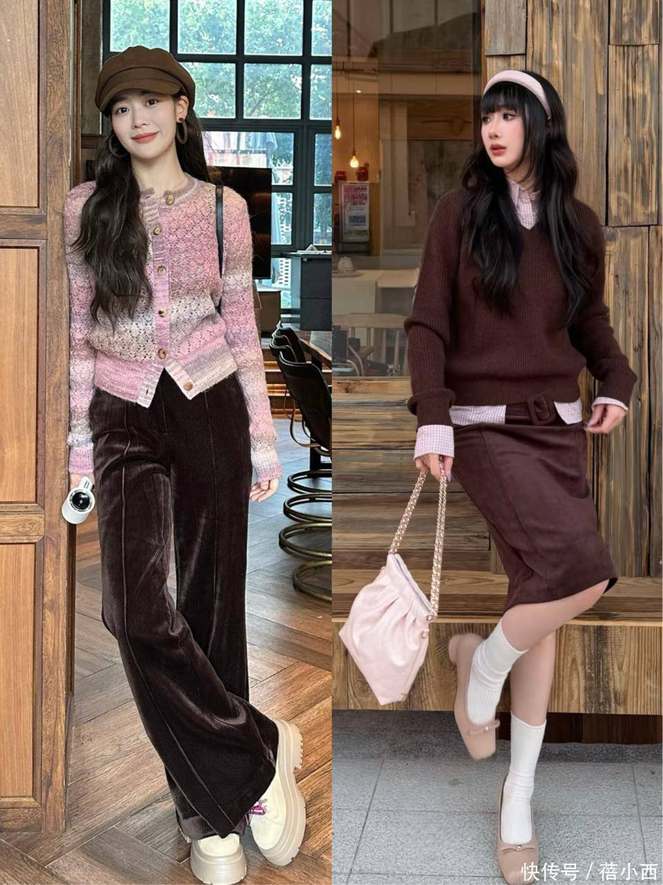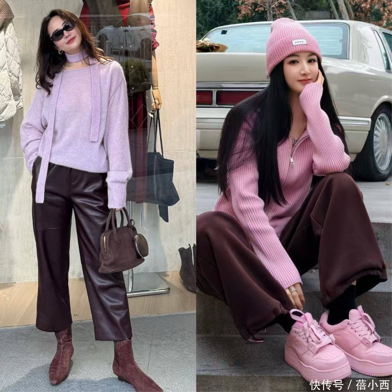 主次分明是棕粉搭配的第一要义,也是新手最易掌握的入门技巧。最稳妥的搭配逻辑是薇娅这种“大面积棕+小面积粉”,让棕色作为基调稳住整体造型,再用粉色作为点睛之笔增添活力。