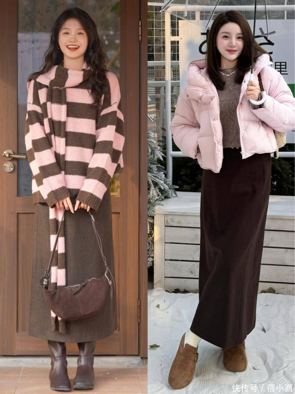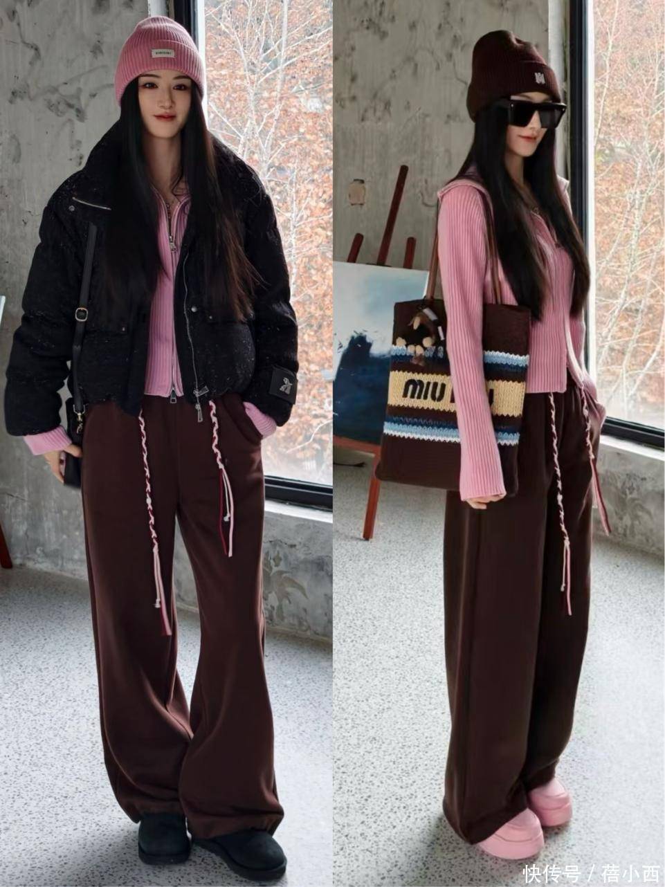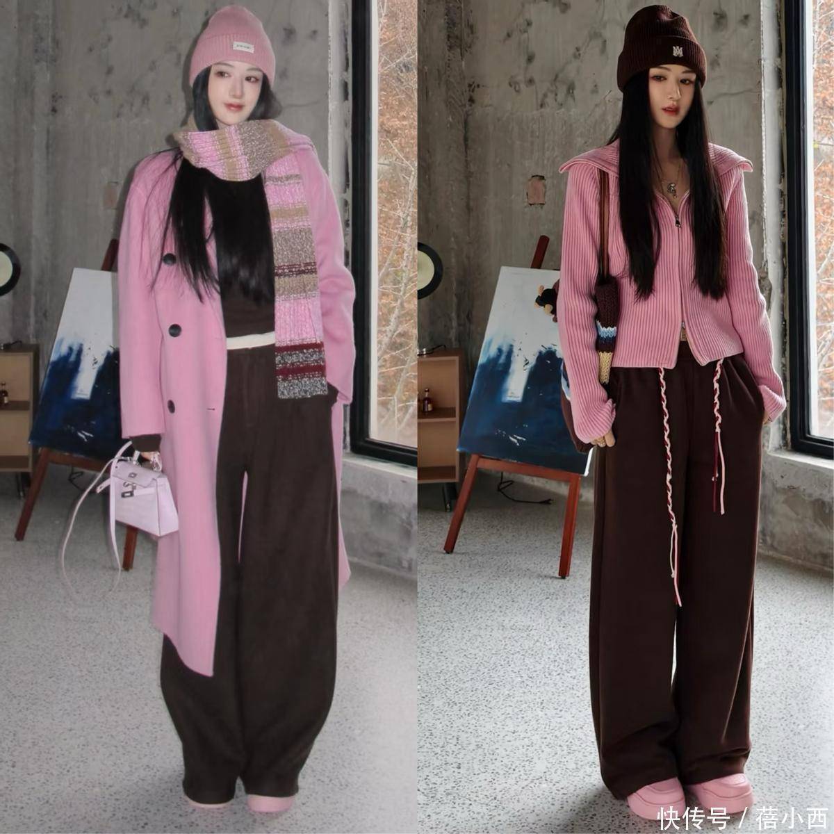 三、粉+棕的同款穿搭模板,覆盖所有冬日场景