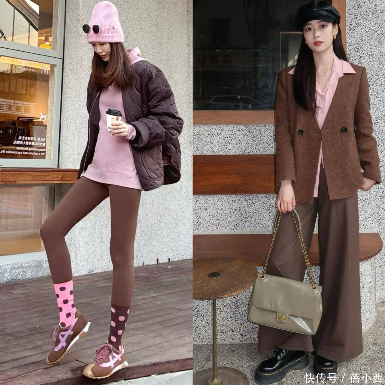 棕色是来自大地的底色,自带温暖、沉稳与安全感,如同冬日里的热可可,总能带来治愈的质感;粉色则是浪漫与活力的代名词,承载着人们对柔软与甜美的向往速盈所,当这两种色彩相遇,用棕色的厚重收敛了粉色的甜腻,让少女感不再流于肤浅,粉色的轻盈点亮了棕色的沉闷,为沉稳注入灵动生机。这种“刚柔并济”的特质,恰好契合了当代女性对穿搭的核心诉求。