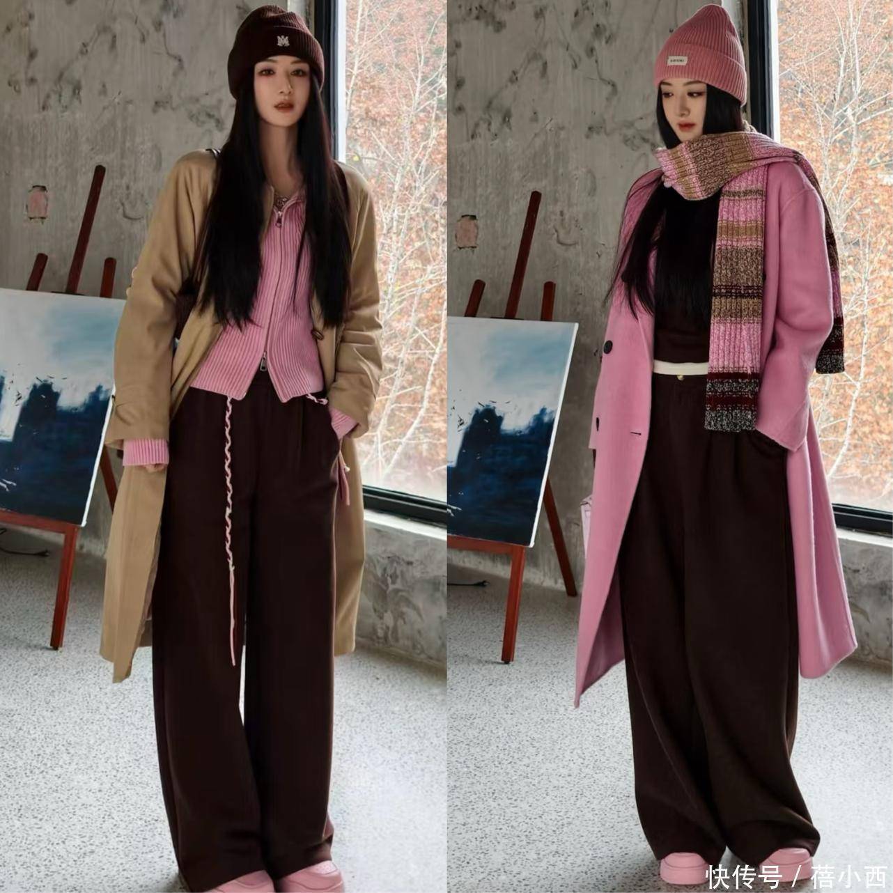 比如薇娅这种粉色大衣搭配棕色打底衫和阔腿裤的look,能够用棕色的硬朗中和粉色的柔美,打造甜酷少女风,再戴一顶针织帽,轻松适配逛街、约会等休闲场景。