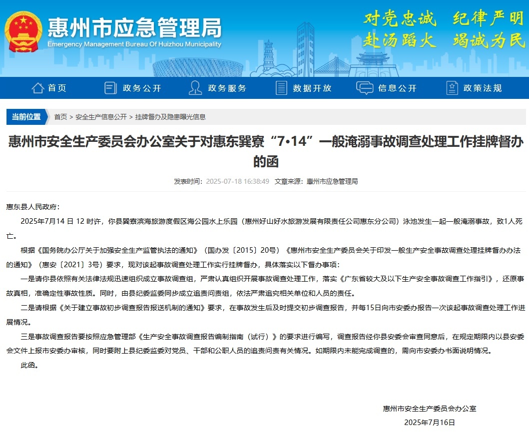 根据《国务院办公厅关于加强安全生产监管执法的通知》(国办发〔2015〕20号)《惠州市安全生产委员会关于印发一般生产安全事故调查处理挂牌督办办法的通知》(惠安〔2021〕3号)要求,现对该起事故调查处理工作实行挂牌督办,具体落实以下督办事项: